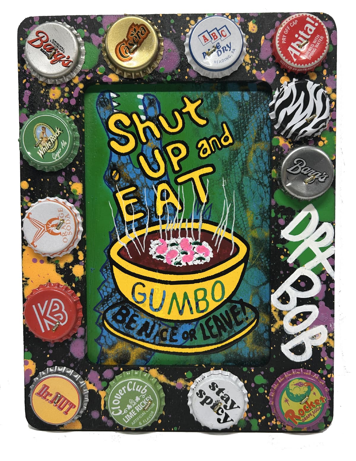 Bottle cap studded folk art on plywood by New Orleans’ own Dr. Bob.